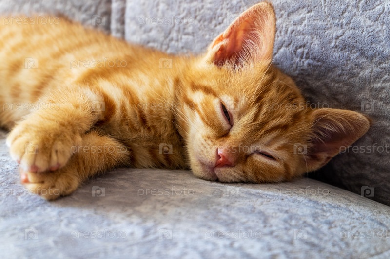Маленький милый рыжий котенок спит на диване. Домашние животные, уход