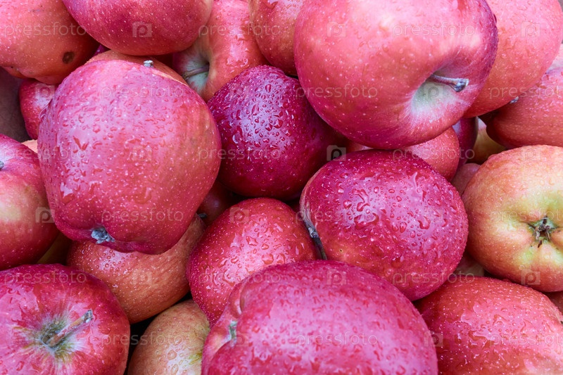 Вкусные красные роскошные яблоки лежат под дождем на прилавке на рынке