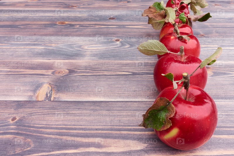 Свежесобранные яблоки с зелеными листьями лежат вертикально на деревянном столе