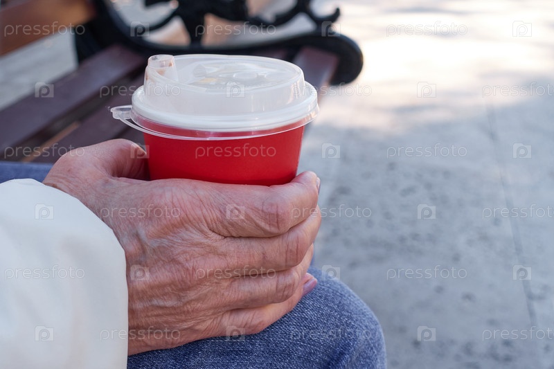 Морщинистая рука бабушки держит стакан кофе. Бабушка в джинсах утром сидит на деревянной скамейке и пьет кофе из красного бумажного стаканчика
