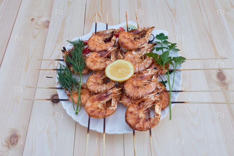 Жареные креветки на деревянных шпажках, выложенные на тарелку, украшенные петрушкой, укропом и лимоном. стоит на деревянном столе