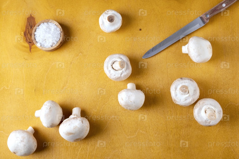 Грибы шампиньоны и кухонный нож на желтом фоне