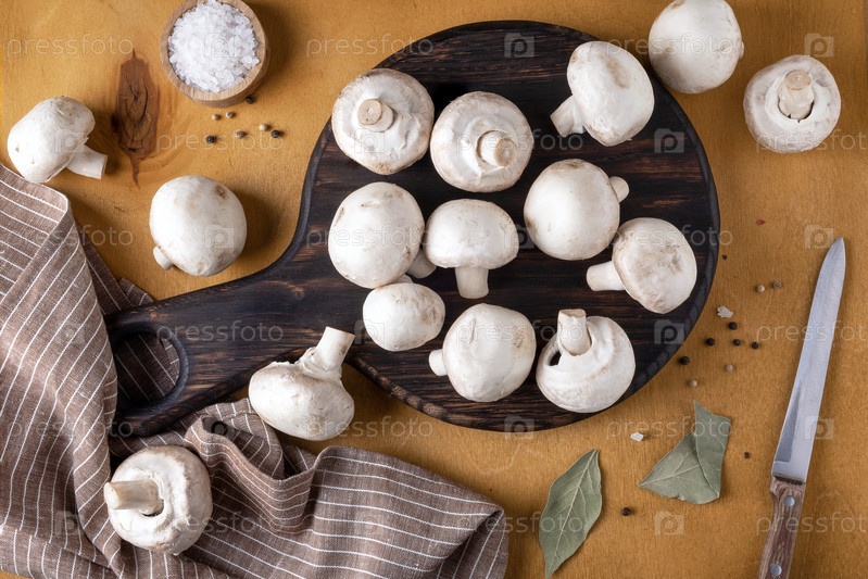 Грибы шампиньоны на деревянной разделочной доске на желтом фоне
