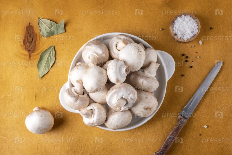 Грибы шампиньоны на белой керамической тарелке на желтом фоне