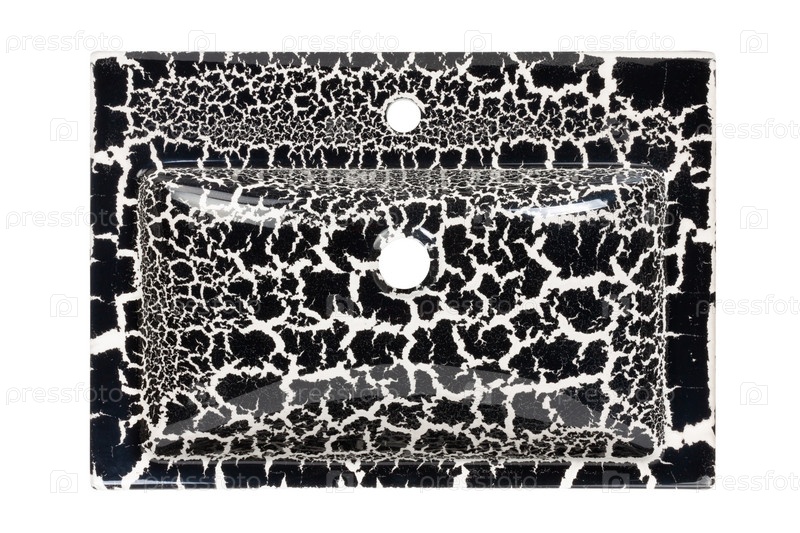 Акриловая черно-белая раковина с эффектом кракелюр, изолированная на белом фоне с металлическими включениями, создающими мерцание и меняющими цвет под разными углами. Вид сверху