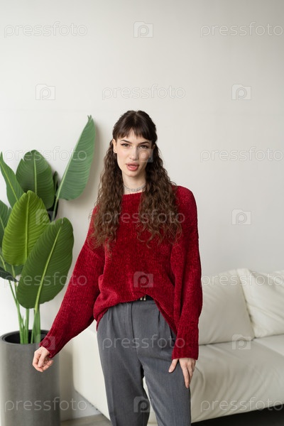 Молодая красивая женщина позирует в красном свитере в студии