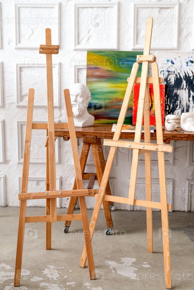 Пустые деревянные мольберты стоят в мастерской художника