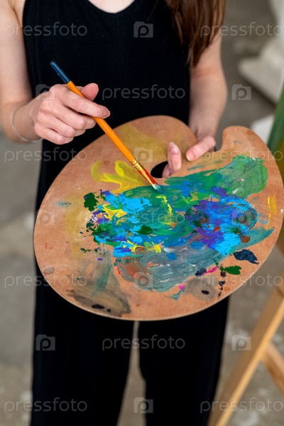 Художник-художник стоит в студии, держа в руках кисть и палитру со смешанными красками