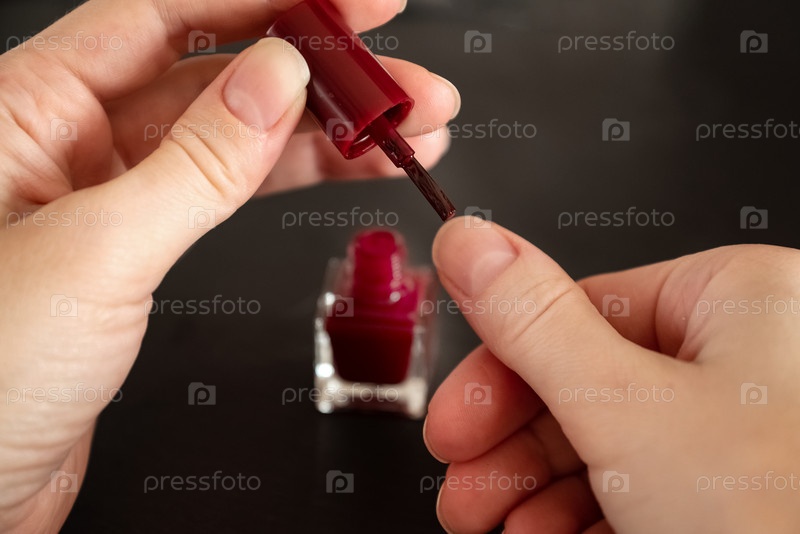 Закрыть руки женщины, готовой нанести красный лак на ногти, сделать маникюр дома