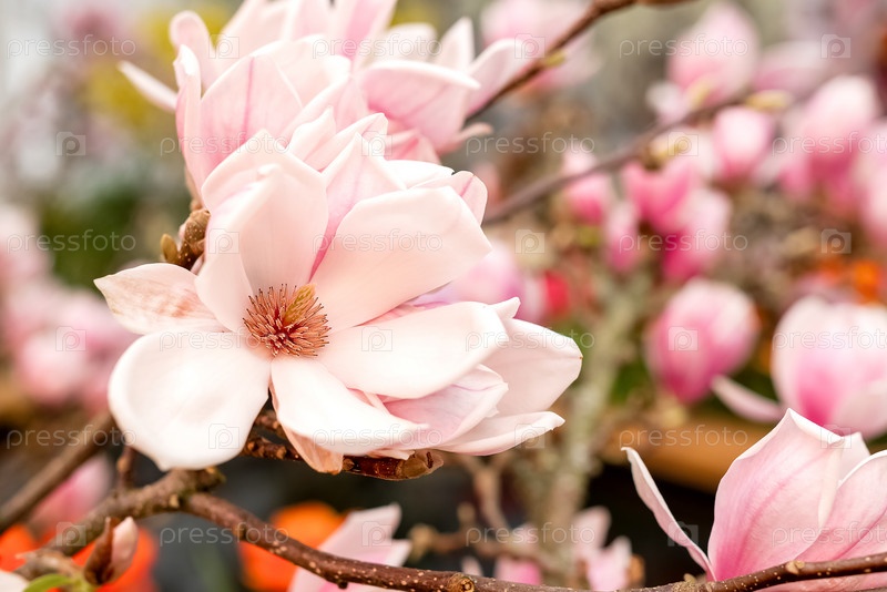 Цветущая ветвь магнолии с нежными розовыми цветами весной крупным планом