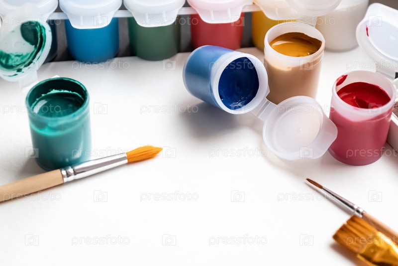 Художественный рабочий стол с пластиковыми банками для гуаши, кистями и бумагой, готовой к рисованию