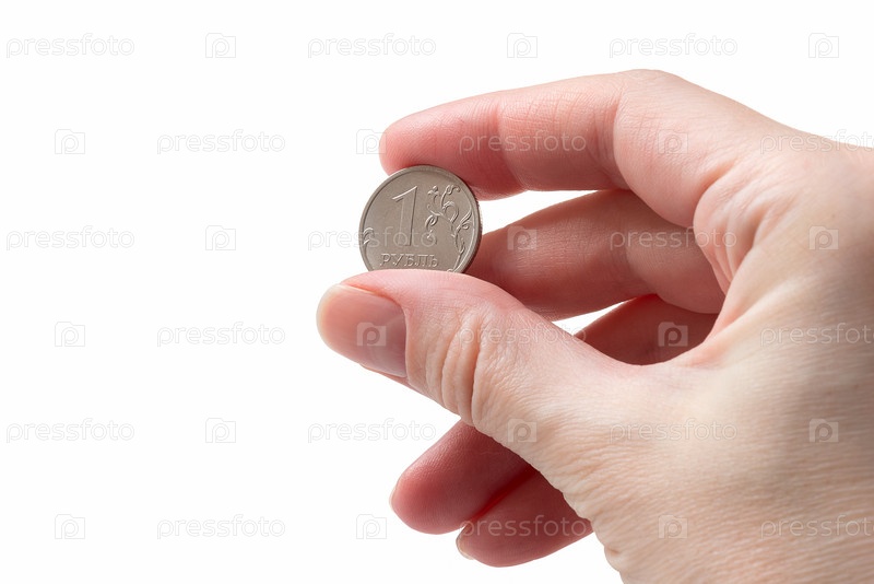 Рублевая монета рядом с рукой человека крупным планом на белом фоне