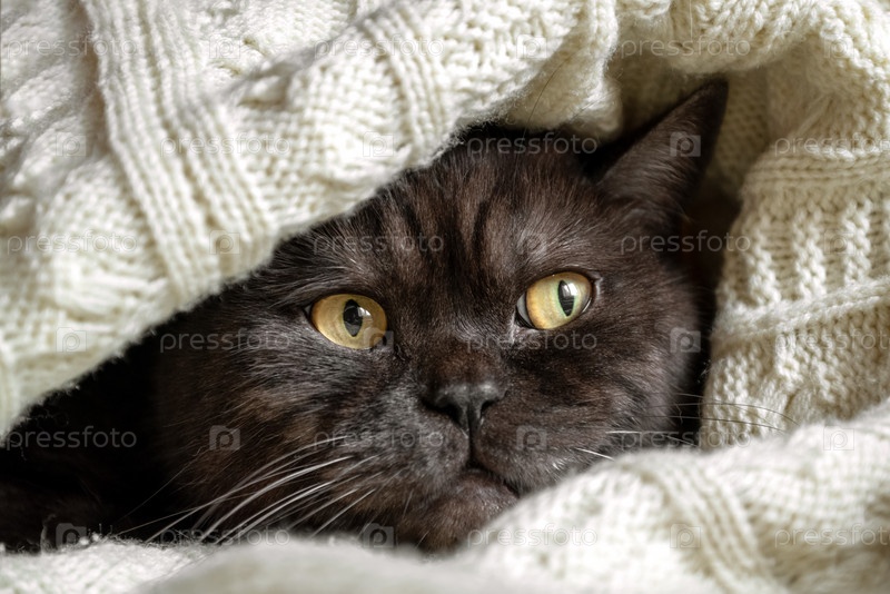 Милый кот выглядывает из-под теплого вязаного пледа крупным планом портрет питомца