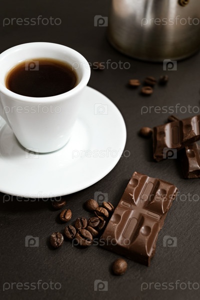 Кусочки шоколада и жареные кофейные зерна разбросаны возле белой чашки кофе на темном фоне
