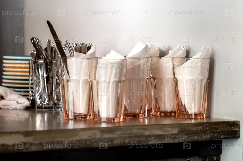 Чистая посуда на столе прилавка в кафе-баре или ресторане