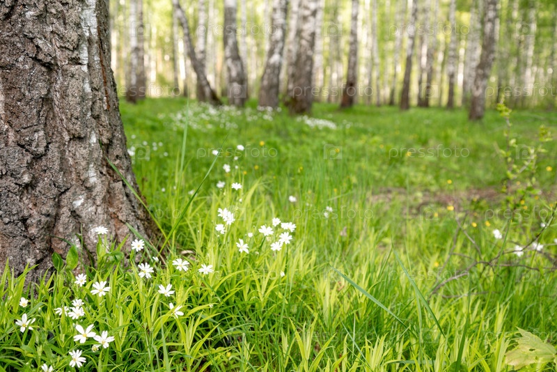 Белые весенние полевые цветы Stellaria растут среди зеленой травы в березовом кусте