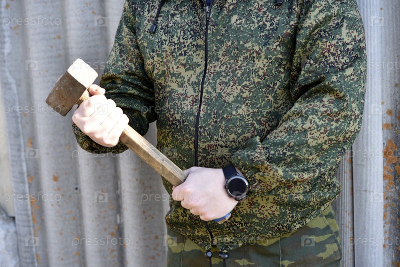 Кувалда в руках мужчины. В руках большой молоток