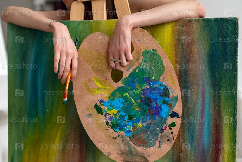 Художник-художник стоит за деревянным мольбертом, вися руками с кистью и палитрой над красочным окрашенным холстом