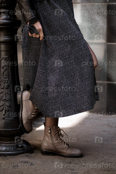Закрыть ноги женщины в кожаных сапогах и длинной юбке, стоящей на улице
