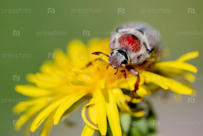 Жук мелолонтха сидит на желтом одуванчике крупным планом