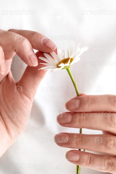 Женщина гадает на цветке ромашки, руки крупным планом