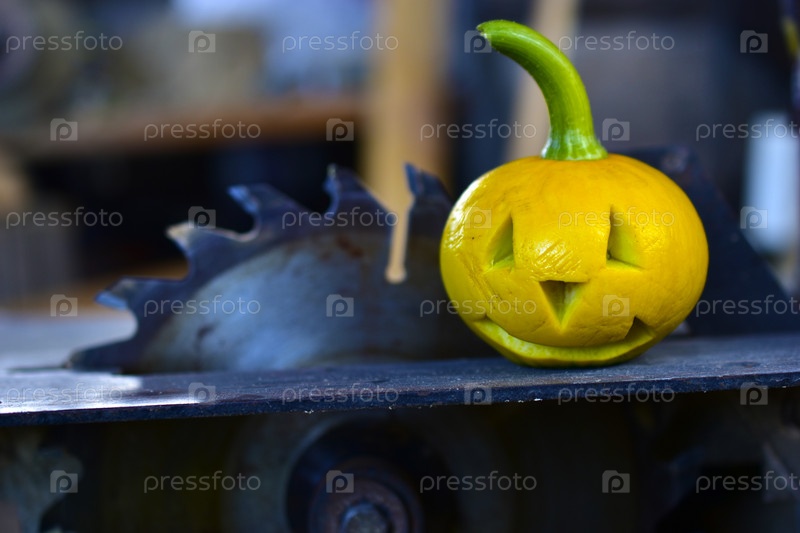 Желтая тыква Хэллоуина на фоне циркулярной пилы