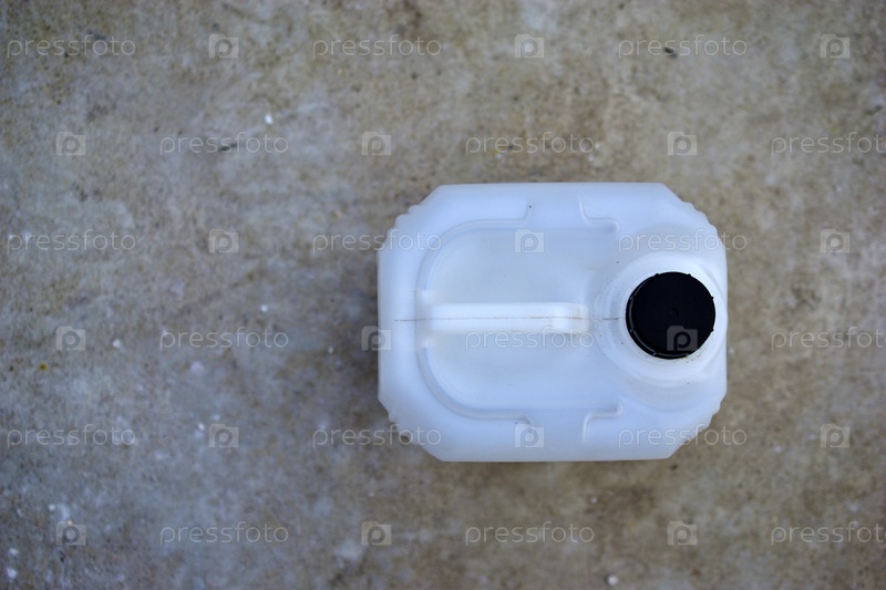 Белая пластиковая канистра с черной крышкой на бетоне