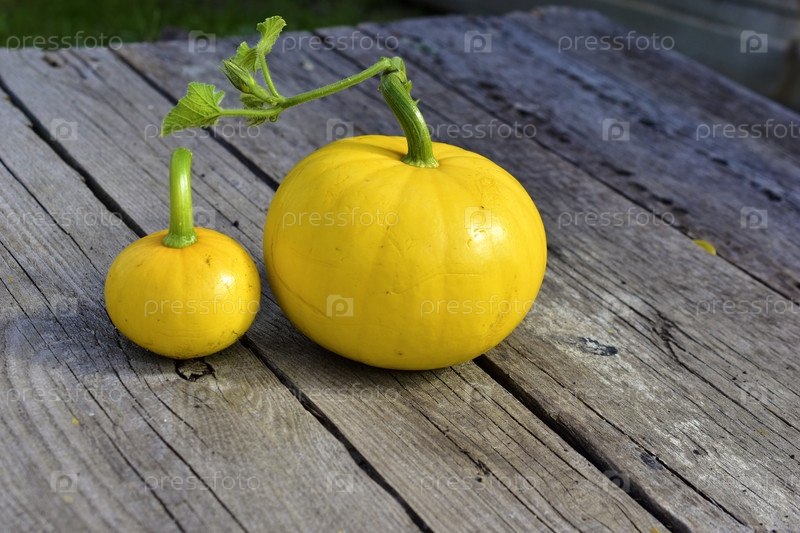 Две желтые тыквы большие и маленькие на фоне дерева