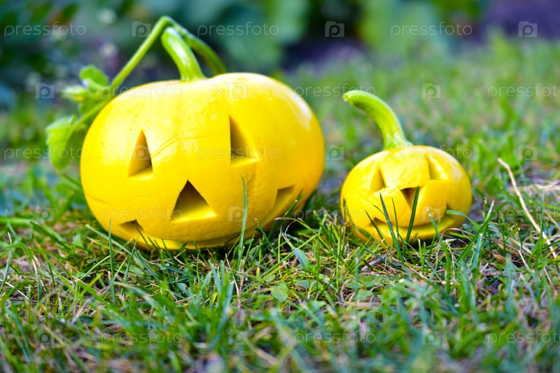 Две желтые тыквы с резными рогами в саду