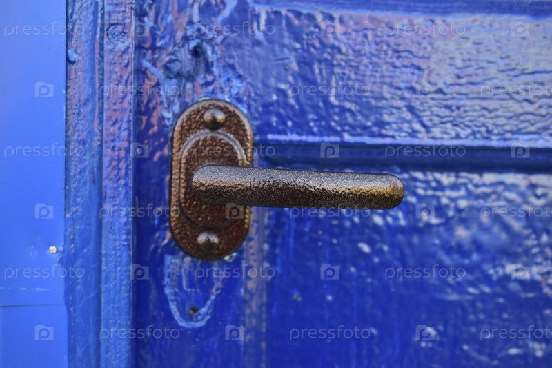 Коричневая железная ручка на свежевыкрашенной синей двери