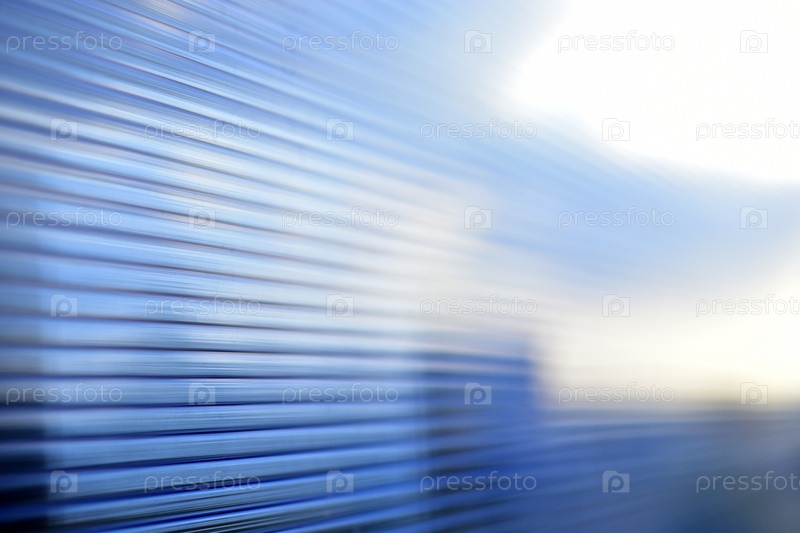 Синяя поверхность полосатого поликарбоната с отражением синей дали города