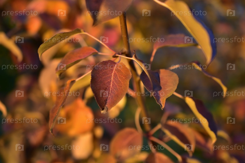 Осенние желтые яблочные листья на вечернем солнце