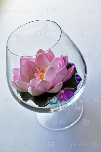 Розовая декоративная лилия лотоса в стеклянном стакане