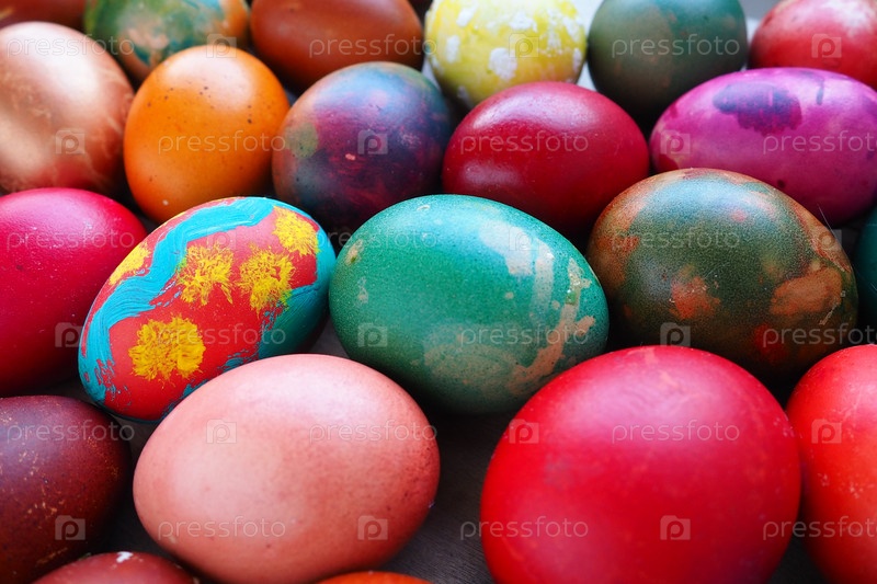 Красочные пасхальные яйца крупным планом. Много красочных праздничных яиц сложены близко друг к другу. Вареные куриные яйца с цветочным и фантазийным узором. Яркий пасхальный фон