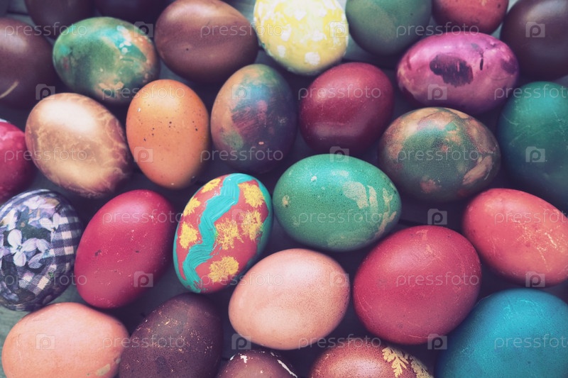 Красочные пасхальные яйца крупным планом. Много красочных праздничных яиц сложены близко друг к другу. Вареные куриные яйца с цветочным и фантазийным узором. Яркий пасхальный фон