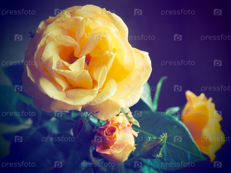 Желтые розы на темном фоне. Красивый букет из 3-х роз. Открытка с 8 марта, Днем матери или Днем святого Валентина. Нежные лепестки роз