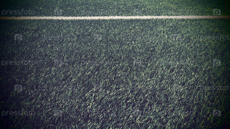 Футбольное поле для чемпионата. Разметка футбольного поля на зеленой траве. Белая линия. Площадь футбольного поля. Ретро или винтажный стиль. Темное виньетирование по краям