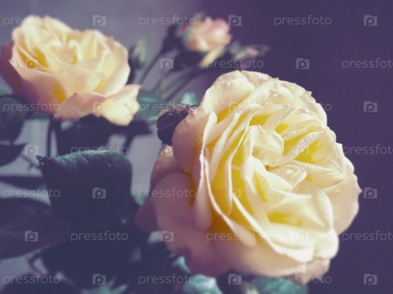 Желтые розы на темном фоне. Красивый букет из 3-х роз. Открытка с 8 марта, Днем матери или Днем святого Валентина. Нежные лепестки роз