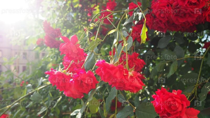 Крупный план куста красных роз в летнем саду под солнечным светом. Красные кустовые розы с множеством бутонов, раскрытые цветы. Клумба в парке, способ украсить улицы и ландшафты