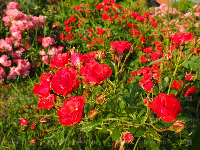 Крупный план куста красных роз в летнем саду под солнечным светом. Красные кустовые розы с множеством бутонов, раскрытые цветы. Клумба в парке, способ украсить улицы и ландшафты
