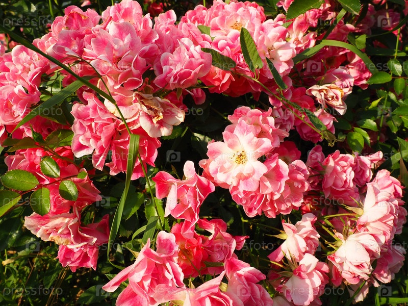 Крупный план куста розовых роз в летнем саду под солнечным светом. Розовые кустовые розы с множеством бутонов, раскрытые цветы. Клумба в парке, способ украсить улицы и ландшафты