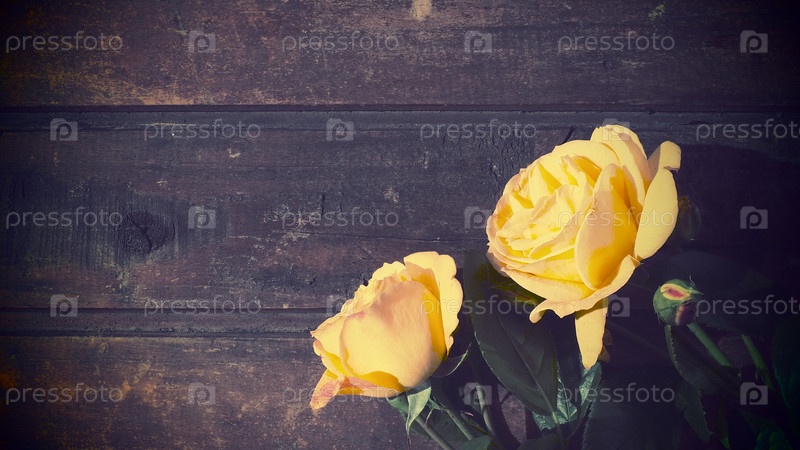 Желтые розы на деревянном фоне. Красивый букет из 3 роз на темном деревянном столе. Открытка с 8 марта, Днем матери или Днем святого Валентина