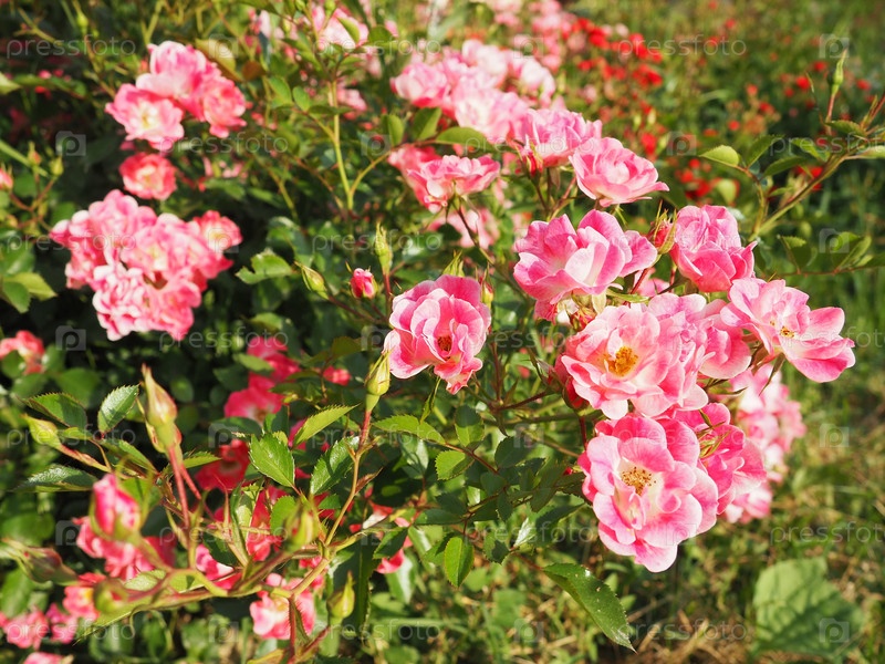 Крупный план куста розовых роз в летнем саду под солнечным светом. Розовые кустовые розы с множеством бутонов, раскрытые цветы. Клумба в парке, способ украсить улицы и ландшафты