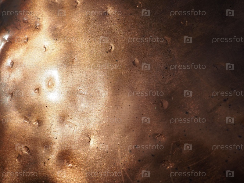 Металлическая фактурная пластина под бронзу. Бронзовая или медная полированная поверхность с вмятинами, царапинами и вмятинами. Текстура металла