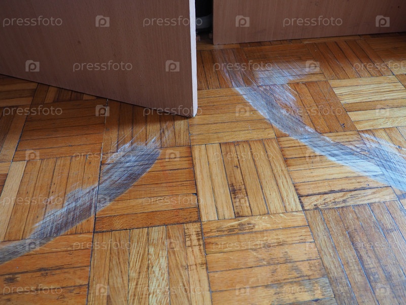 Поцарапанный паркет в комнате. Царапины, сколы и вмятины на полу. Паркет требует ремонта. Двери шкафа царапают пол. Нерегулируемая высота мебельных дверей