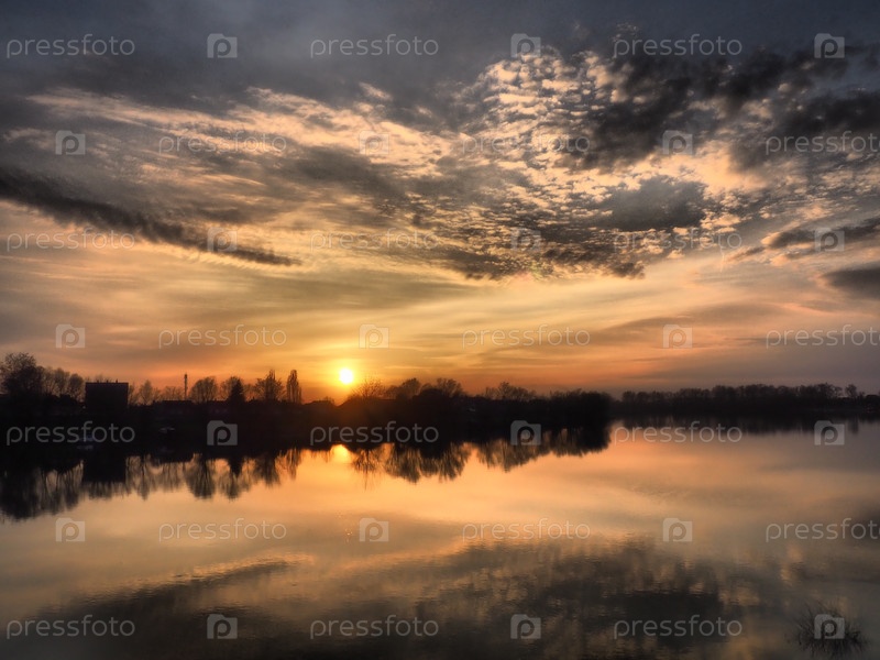Очень красивый закат над водой. Берег реки и горизонт. Яркие облака нарисованы вечерним солнцем. Заходящее солнце. Желтое, оранжевое, серое драматическое небо и облака