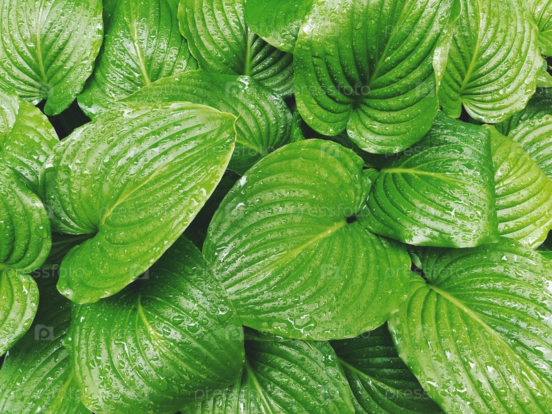 Хоста, род многолетних травянистых растений семейства Спаржевые. Садоводство и ландшафтный дизайн. Теневыносливые декоративно-лиственные растения. Зеленые листья с каплями воды