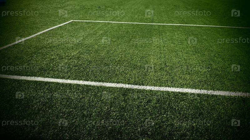 Футбольное поле для чемпионата. Разметка футбольного поля на зеленой траве. Белые линии шириной не более 12 см или 5 дюймов. Площадь футбольного поля