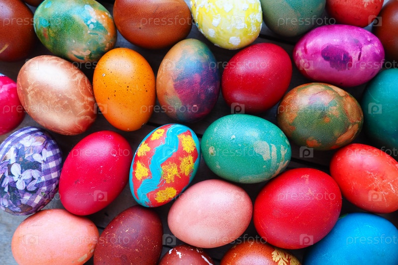 Красочные пасхальные яйца крупным планом. Много красочных праздничных яиц сложены близко друг к другу. Вареные куриные яйца с цветочным и фантазийным узором. Яркий пасхальный фон