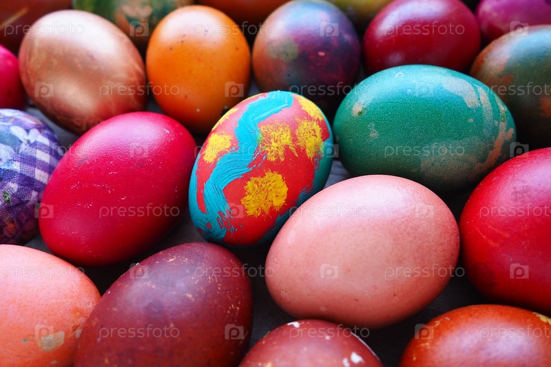 Красочные пасхальные яйца крупным планом. Много красочных праздничных яиц сложены близко друг к другу. Вареные куриные яйца с цветочным и фантазийным узором. Яркий пасхальный фон